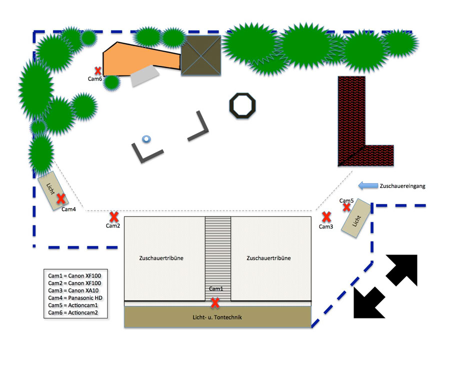 Die Kamerapositionen konnten wir nur theoretisch vor planen siehe Skizze unten und für uns grob festlegen wie viele Kameras mit laufen sollten. Schließlich war der Tag gekommen - es fand die Generalprobe statt. Wir wollten diesen Tag nutzen und die gesamte Technik einmal Live in voller Länge mit laufen zu lassen.