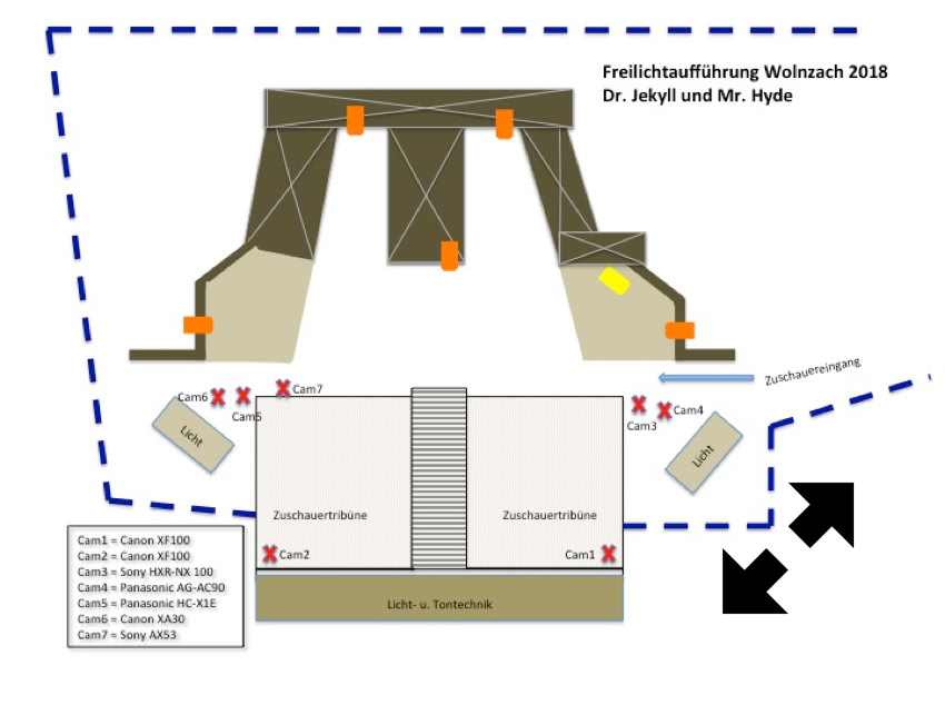 Auch bei dieser Freilichttheateraufführung konnten wir die Kamerapositionen nur theoretisch vor planen siehe Skizze unten und für uns grob festlegen wie viele Kameras mit laufen sollten.