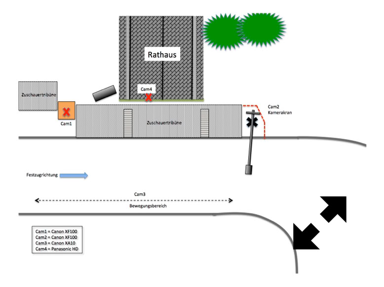 Wir hatten 4 FullHD-Kameras im Einsatz. Eine Kamera wurde an der Haupttribühne platziert, die 2. Kamera war unsere “Schwebestativ-Kamera”, eine andere war oben im Rathausfenster fixiert und natürlich war auch wieder der Kamerakran im Einsatz, dieser war auch mit einer HD-Kamera bestückt (siehe Bilder unten).
