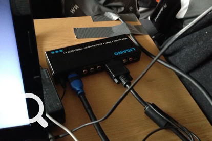 Schließlich wurden wir fündig und beschlossen ein 25 Meter „aktiv HDMI-Kabel“ gekauft, d.h. es hatte einen Signalverstärker eingebaut. Da der Beamer keinen direkten HDMI-Eingang besaß, mussten wir noch eine Umschaltbox dazu kaufen, um ein VGA-Signal zu bekommen. Die nun erreichte Live-Bild Qualität auf der großen Leinwand war um einiges besser als bei den zwei letzten Premiere Veranstaltungen. Wir waren begeistert.