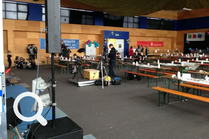 1x Canon XF100, Manfrotto-Stativ mit Hintergrundfernbedienung (Live-Bild für die Halle)