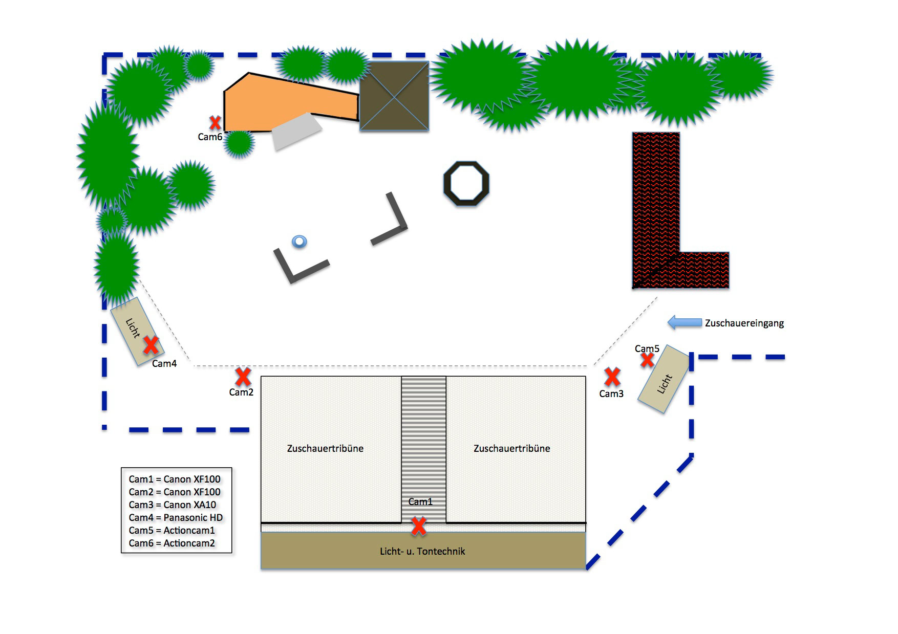 Die Kamerapositionen konnten wir nur theoretisch vor planen siehe Skizze unten und für uns grob festlegen wie viele Kameras mit laufen sollten. Schließlich war der Tag gekommen - es fand die Generalprobe statt. Wir wollten diesen Tag nutzen und die gesamte Technik einmal Live in voller Länge mit laufen zu lassen.
