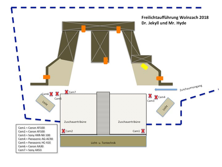 Auch bei dieser Freilichttheateraufführung konnten wir die Kamerapositionen nur theoretisch vor planen siehe Skizze unten und für uns grob festlegen wie viele Kameras mit laufen sollten.