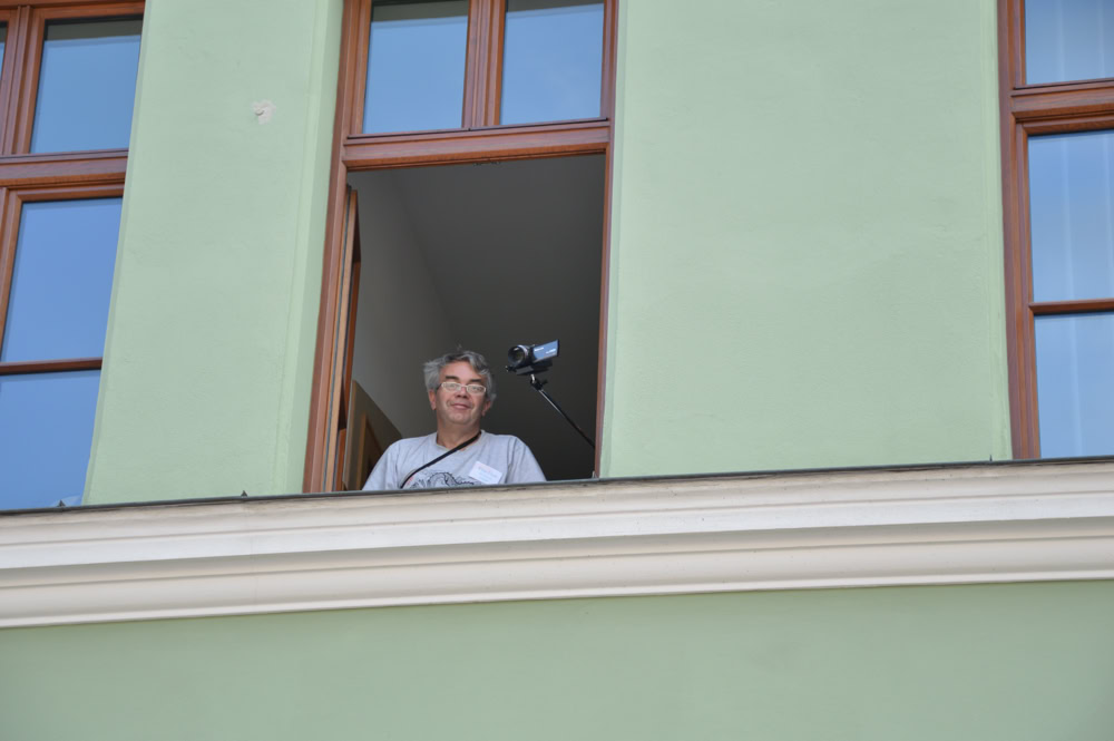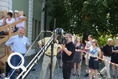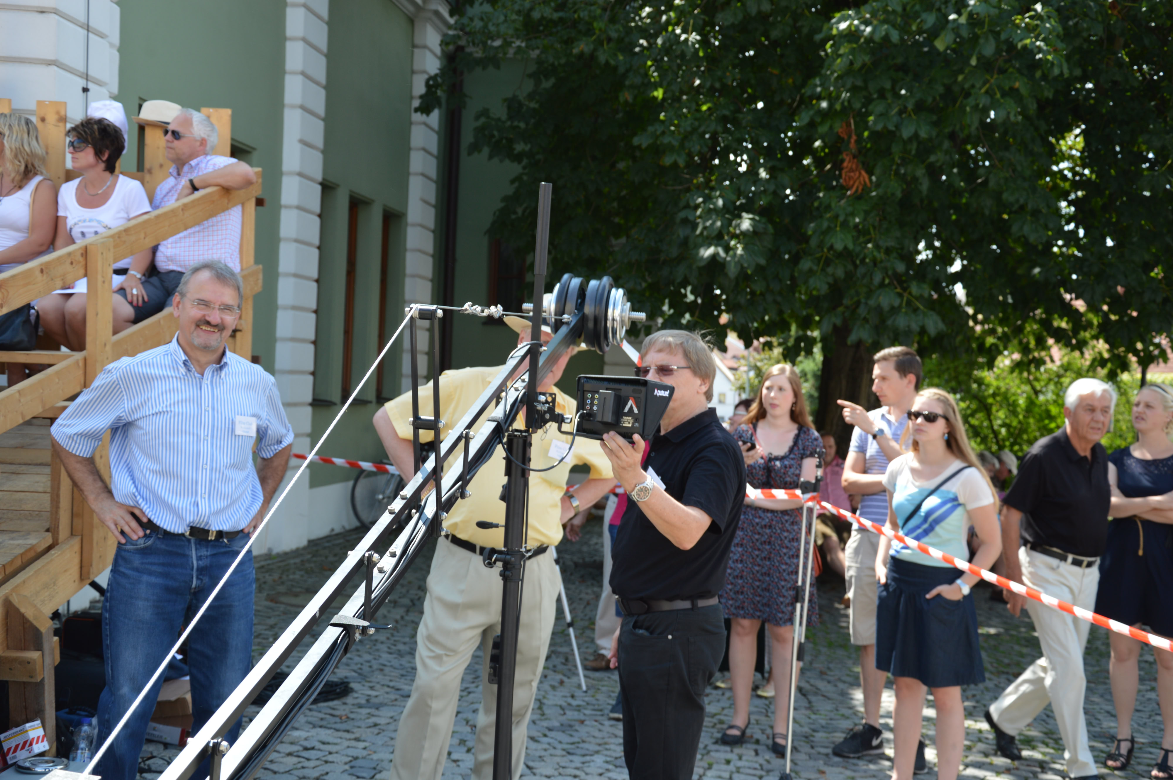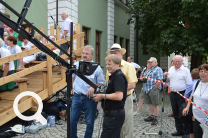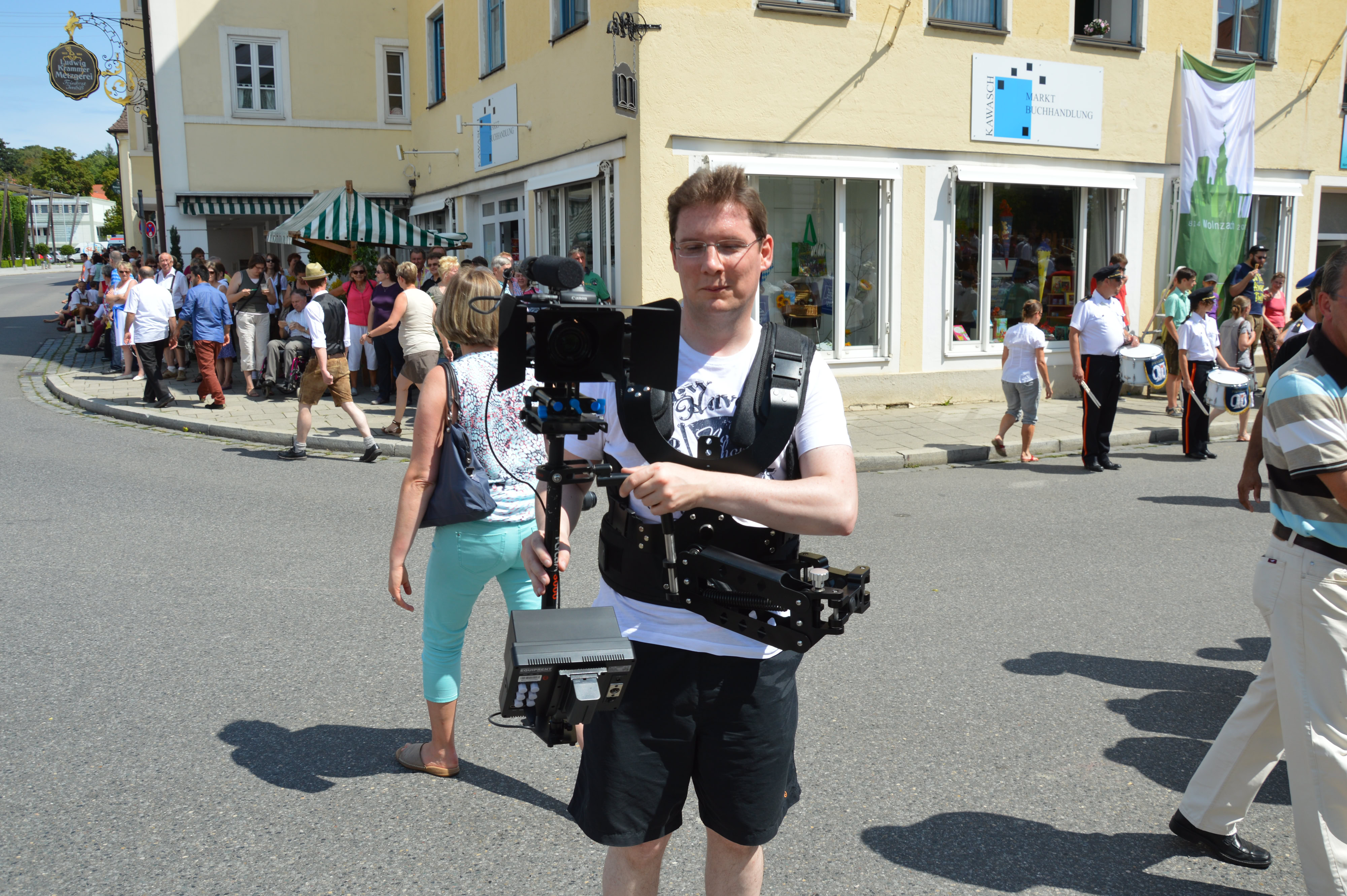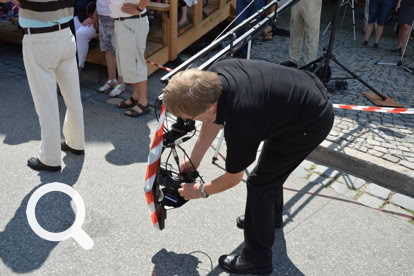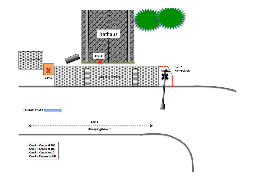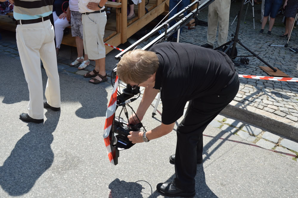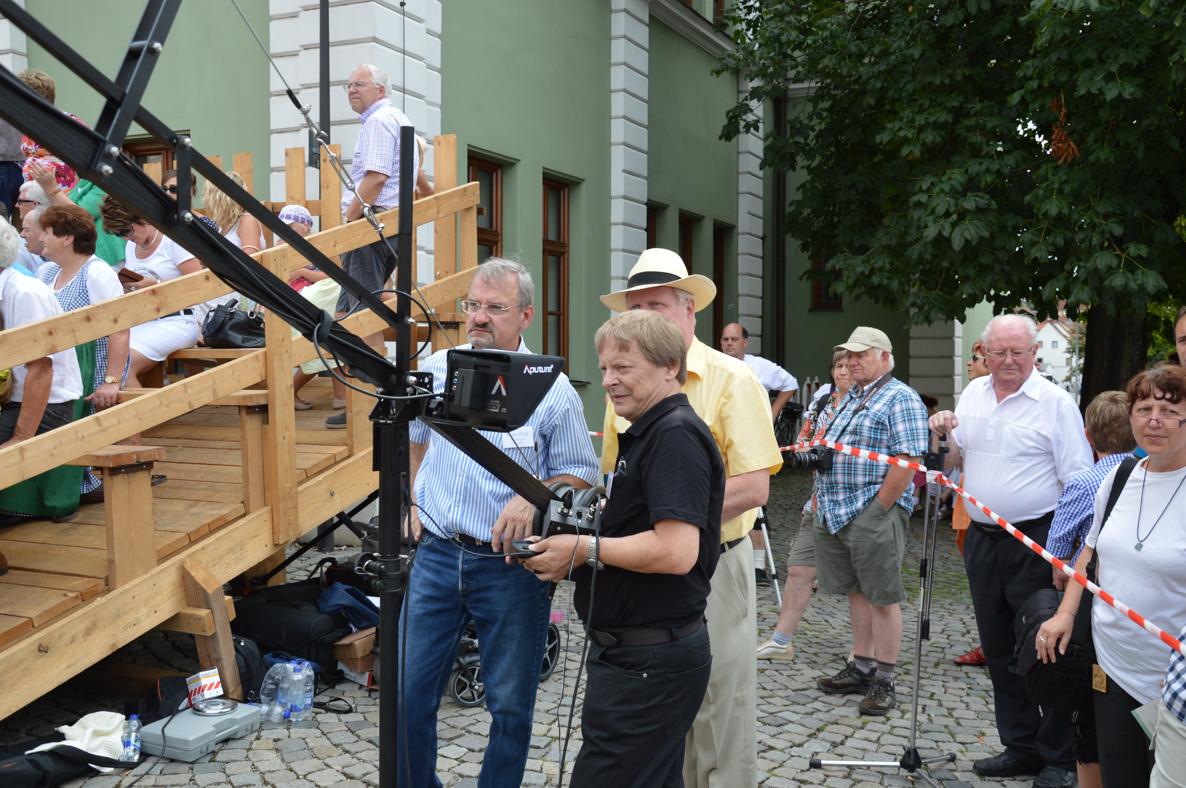 Wir hatten 4 FullHD-Kameras im Einsatz. Eine Kamera wurde an der Haupttribühne platziert, die 2. Kamera war unsere “Schwebestativ-Kamera”, eine andere war oben im Rathausfenster fixiert und natürlich war auch wieder der Kamerakran im Einsatz, dieser war auch mit einer HD-Kamera bestückt (siehe Bilder unten).