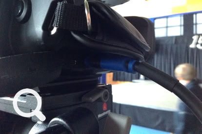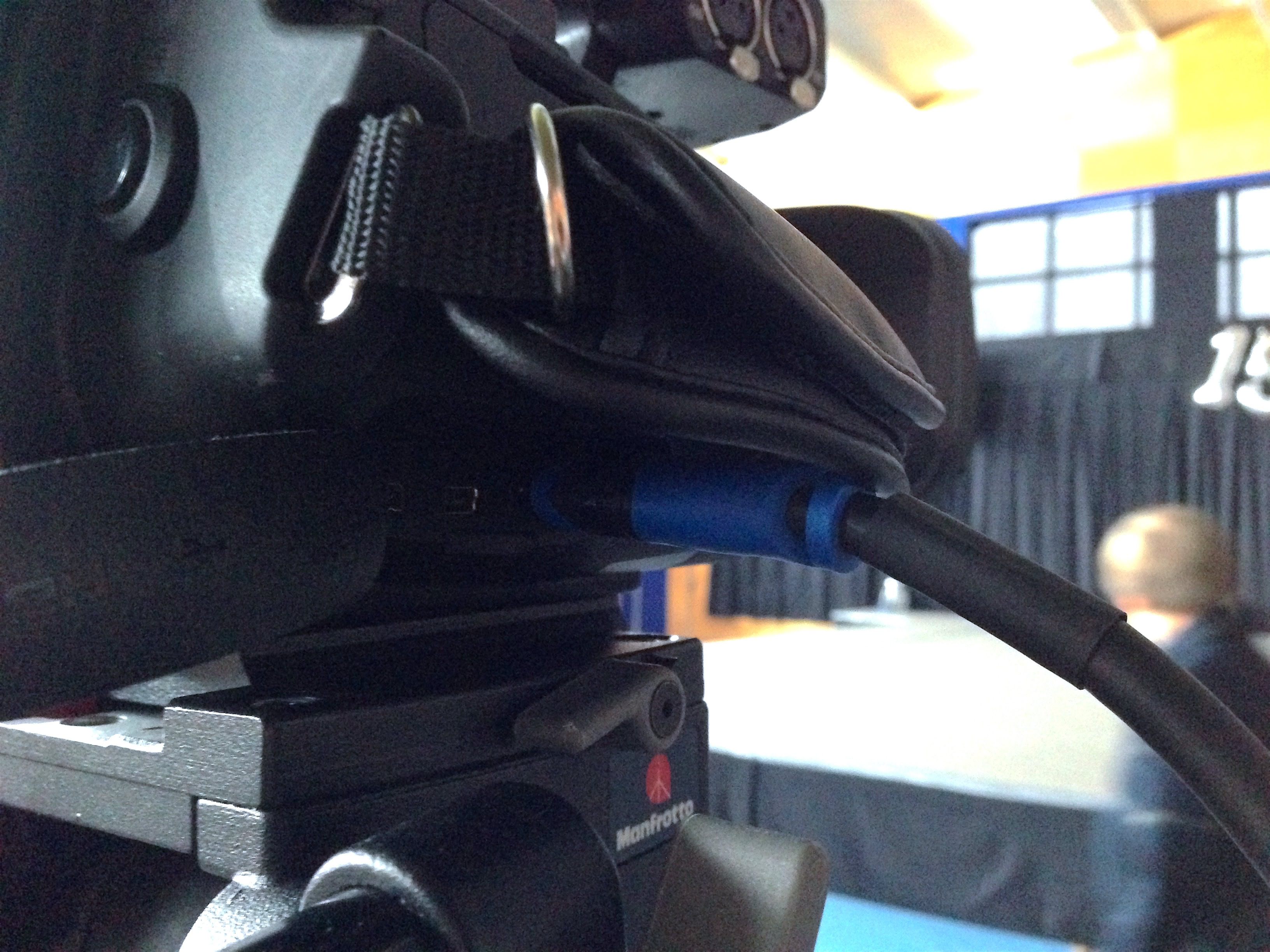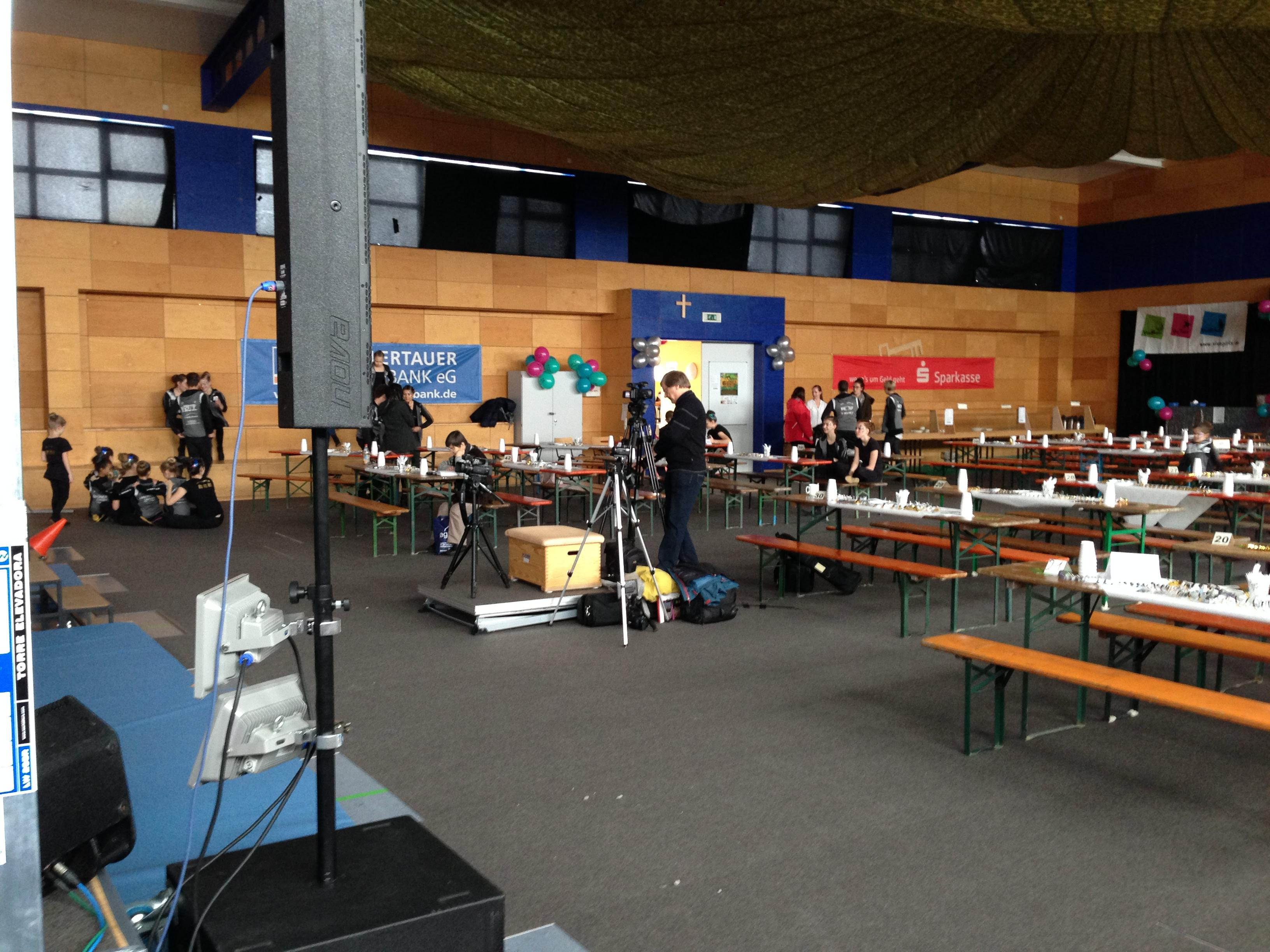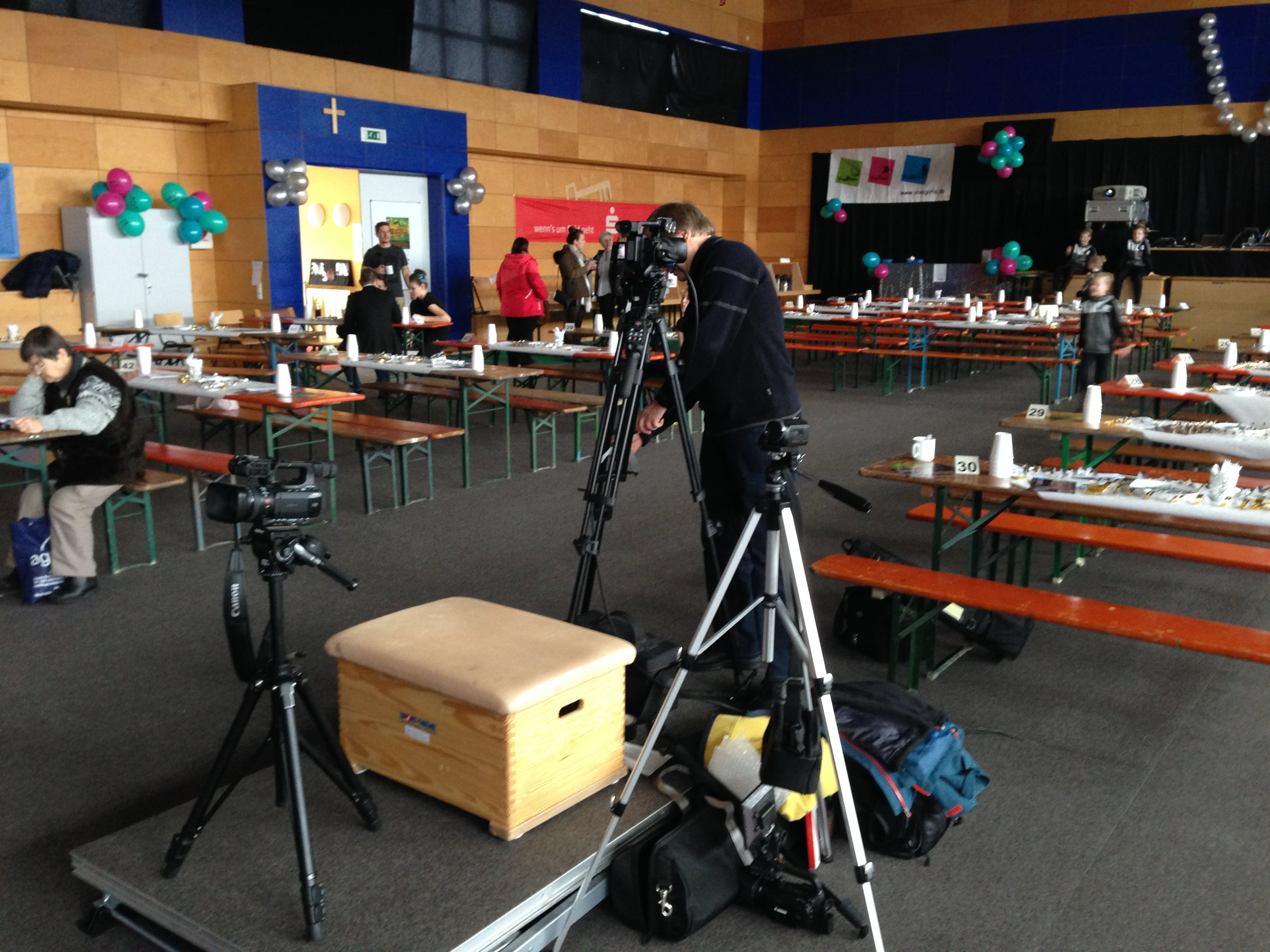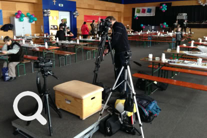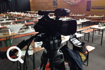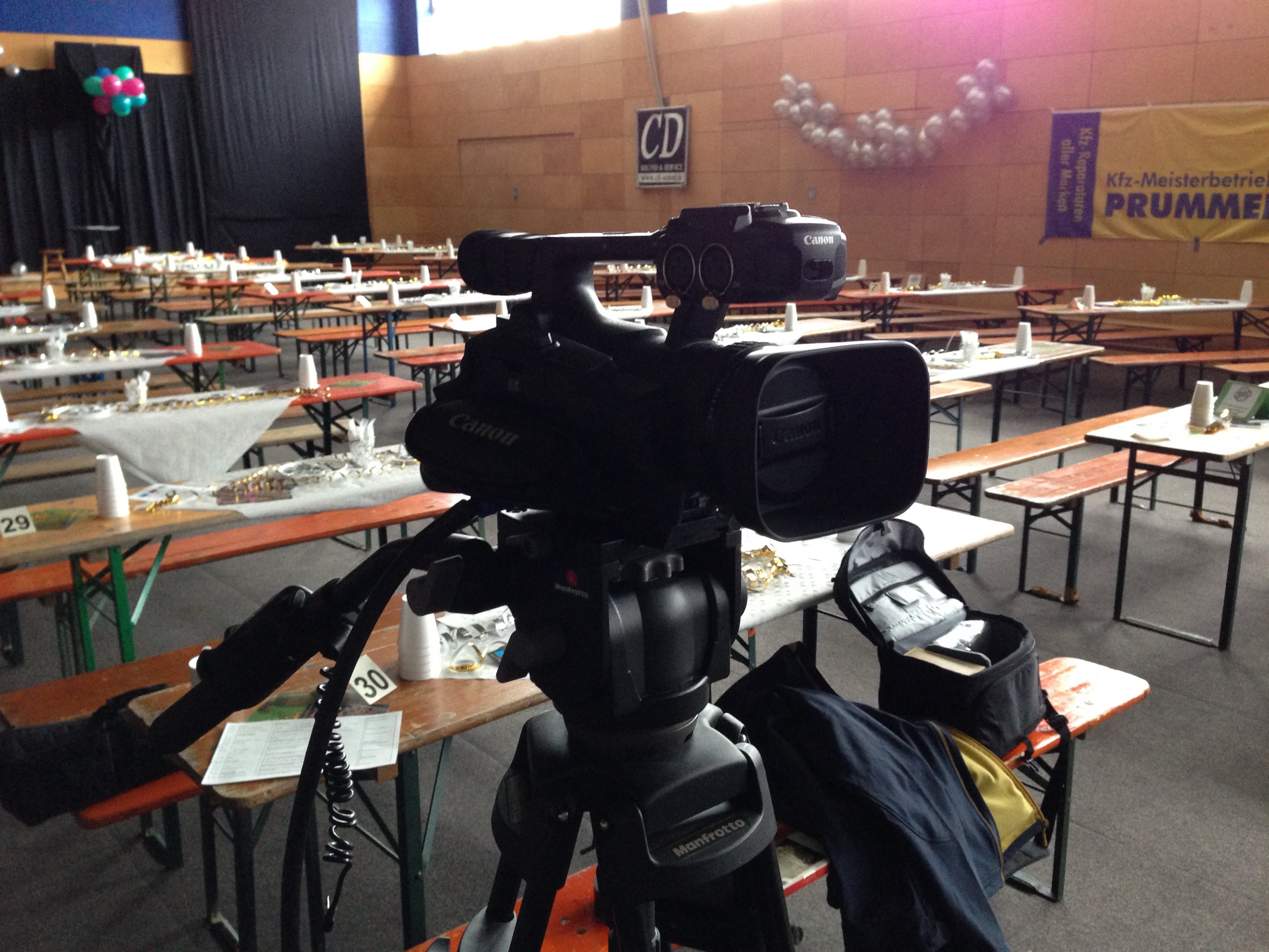 1x Canon XF100, Manfrotto-Stativ mit Hintergrundfernbedienung (Live-Bild für die Halle)