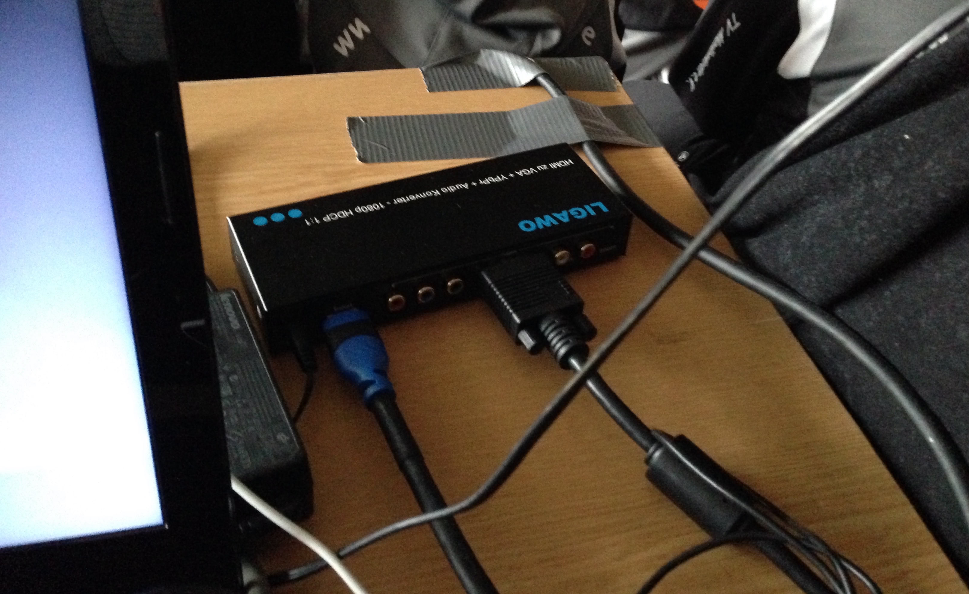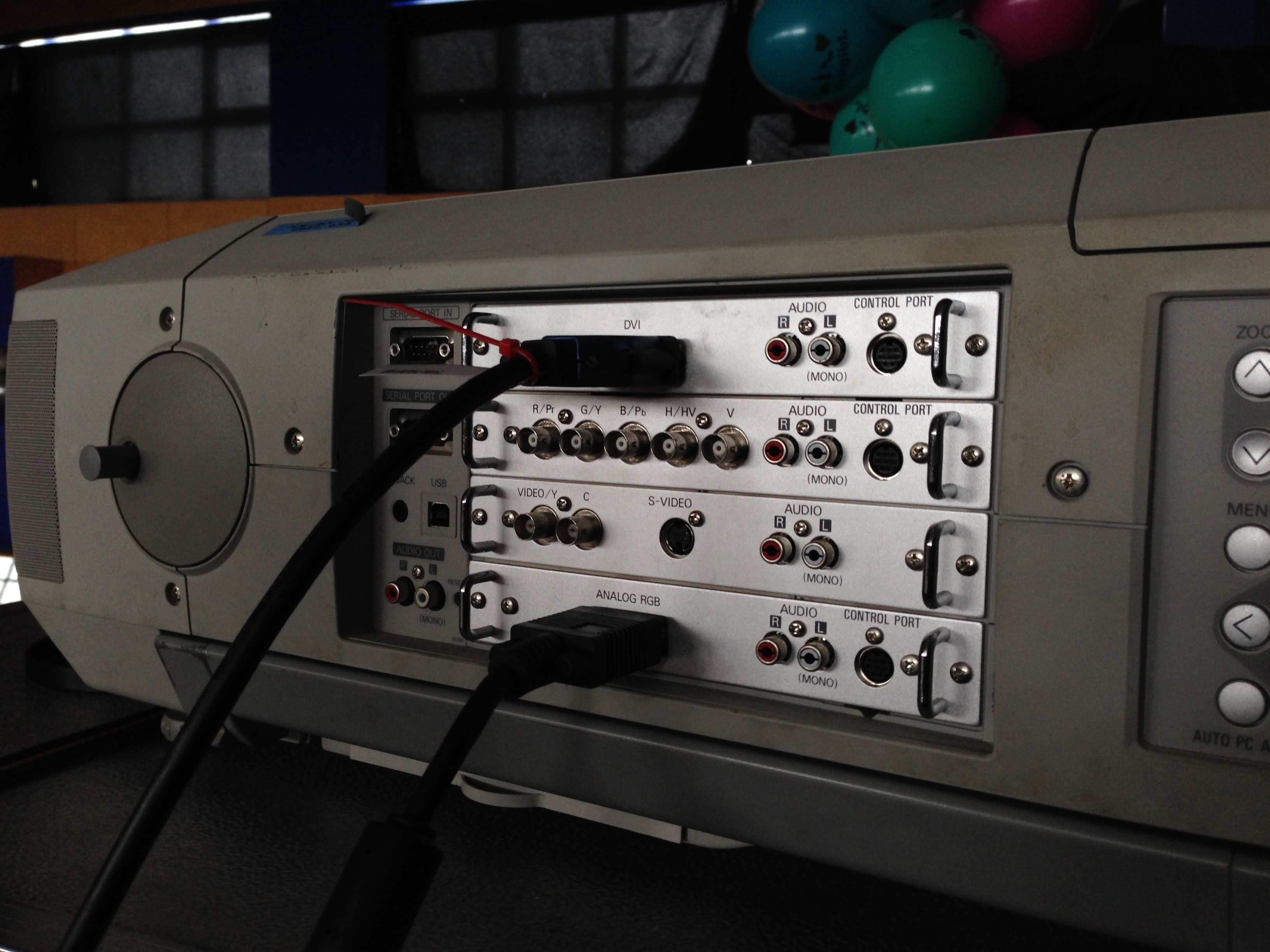 Schließlich wurden wir fündig und beschlossen ein 25 Meter „aktiv HDMI-Kabel“ gekauft, d.h. es hatte einen Signalverstärker eingebaut. Da der Beamer keinen direkten HDMI-Eingang besaß, mussten wir noch eine Umschaltbox dazu kaufen, um ein VGA-Signal zu bekommen. Die nun erreichte Live-Bild Qualität auf der großen Leinwand war um einiges besser als bei den zwei letzten Premiere Veranstaltungen. Wir waren begeistert.