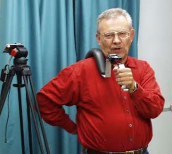 Ein praktisches Schulterstativ, wird am Hosengürtel im Rückenbereich für besseren Halt eingehakt (Marke Eigenbau)